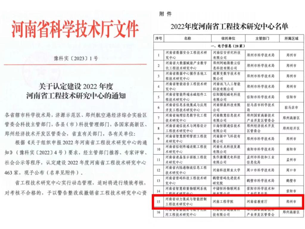 近日,河南省科技厅豫科实〔2023〕1号文件通知,我校电气信息工程学院申报的“河南省动力集成与智能控制工程技术研究中心”获批立项建设。省工程技术研究中心是根据《关于组织申报2022年河南省工程技术研究中心的通知》(豫科实〔2022〕4号)要求,紧密围绕我省战略性新兴产业和我校重点支持的优势专业开展建设,经教育厅推荐、专家评审、社会公示、科技厅认定等程序后立项,全省共立项463家。校领导对本次中心申报高度重视,带领科研处等部门及科研团队负责人积极开展申报研讨会,协调沟通,凝练研究方向,最终确定我校工程技术研究中心的申报材料。