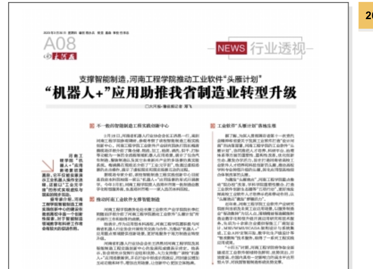 3月29日,《大河报》在第A08版对我校做了题为《支撑智能制造,77779193永利官网推动工业软件“头雁计划”“机器人+”应用助推我省制造业转型升级》专题报道。