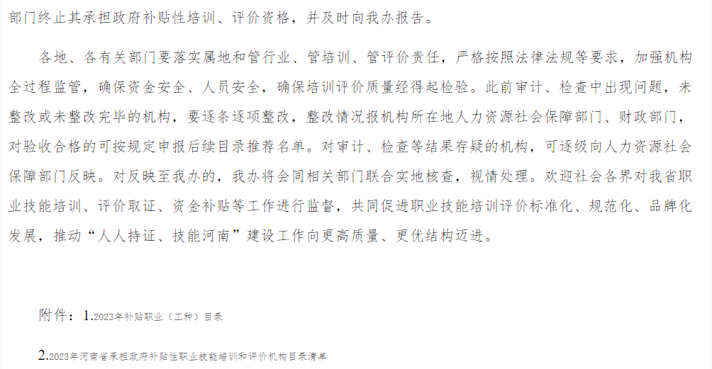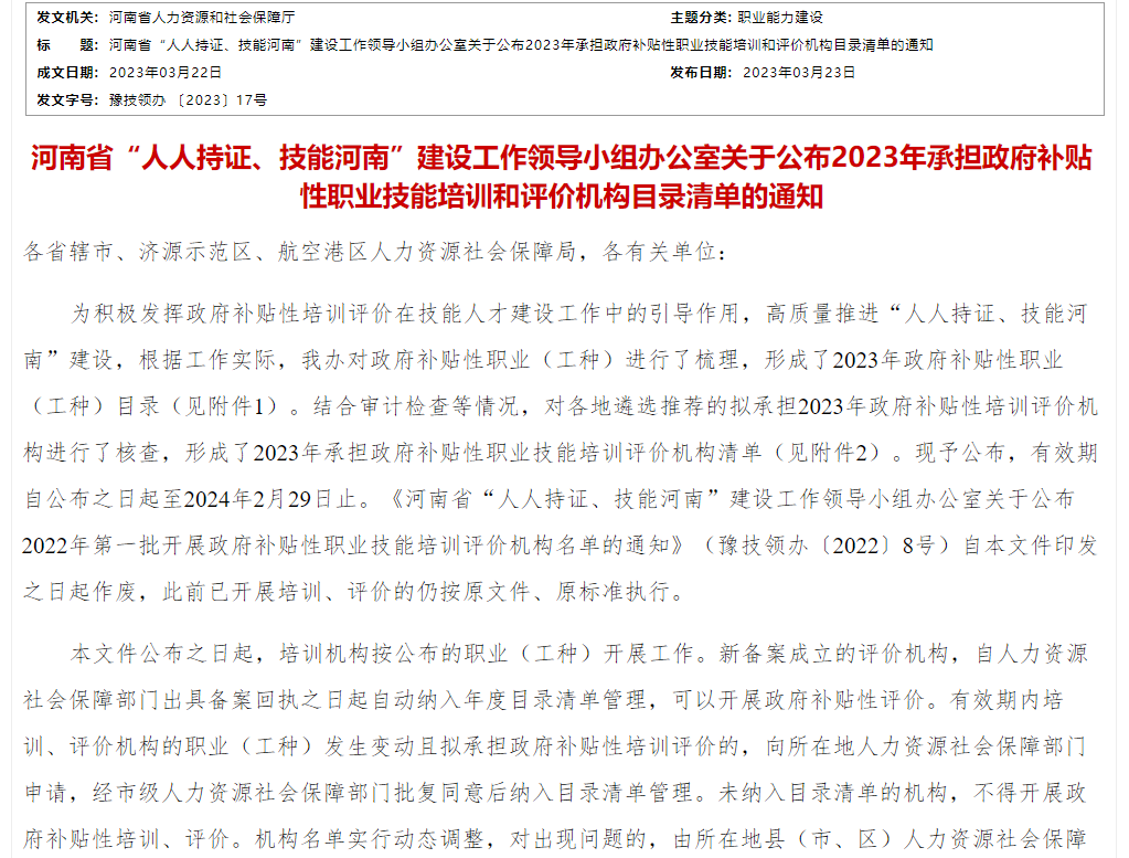日前,河南省“人人持证、技能河南”建设工作领导小组办公室公布了2023年承担政府补贴性职业技能培训和评价机构目录清单。我校电工、服装制版师、物流服务师、制冷空调系统安装维修工、电气设备安装工、计算机程序设计员、纺织纤维检验工、纤维检验员、中央空调系统运行操作员、水工监测工等10个工种,已经纳入2023年河南省承担政府补贴性职业技能培训评价机构目录清单。