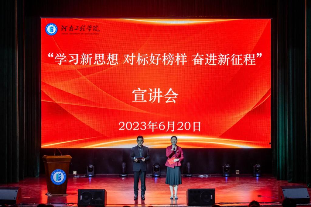 为充分发挥“河工榜样”示范引领作用,教育引导广大党员干部和师生学习榜样、争当先进,担当作为、建功立业,推进学习贯彻习近平新时代中国特色社会主义思想主题教育走深走实,6 月20日下午,学校在西校区创新创业中心礼堂举办“学习新思想 对标好榜样 奋进新征程”宣讲会。省委主题教育第二十四巡回指导组组长刘兴彬,指导组成员刘振卫、苏舸和学校领导班子成员出席宣讲会,全体中层领导人员、党支部书记、组织员和新入党党员代表500余人参加会议。