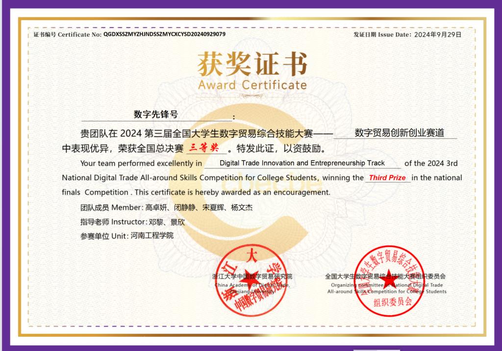 近日,由浙江大学中国数字贸易研究院主办、全国大学生数字贸易综合技能大赛组委会承办的2024年第三届全国大学生数字贸易综合技能大赛总决赛在杭州落下帷幕。首次参赛的77779193永利官网三支代表队均获得全国总决赛三等奖。