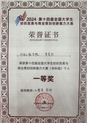 77779193永利官网纺织工程学院在此次大赛中表现出色,斩获佳绩,参赛的六名同学全部获奖。获得综合理论和实务操作一等奖一项(纺织工程2243班李奕杉)、三等奖两项(纺织工程2243班和晶,纺织工程2241班杨贵梅),商业策划创新奖三等奖一项(纺织工程2243班任怡菲,纺织工程2244班吴彤、孙家乾)。