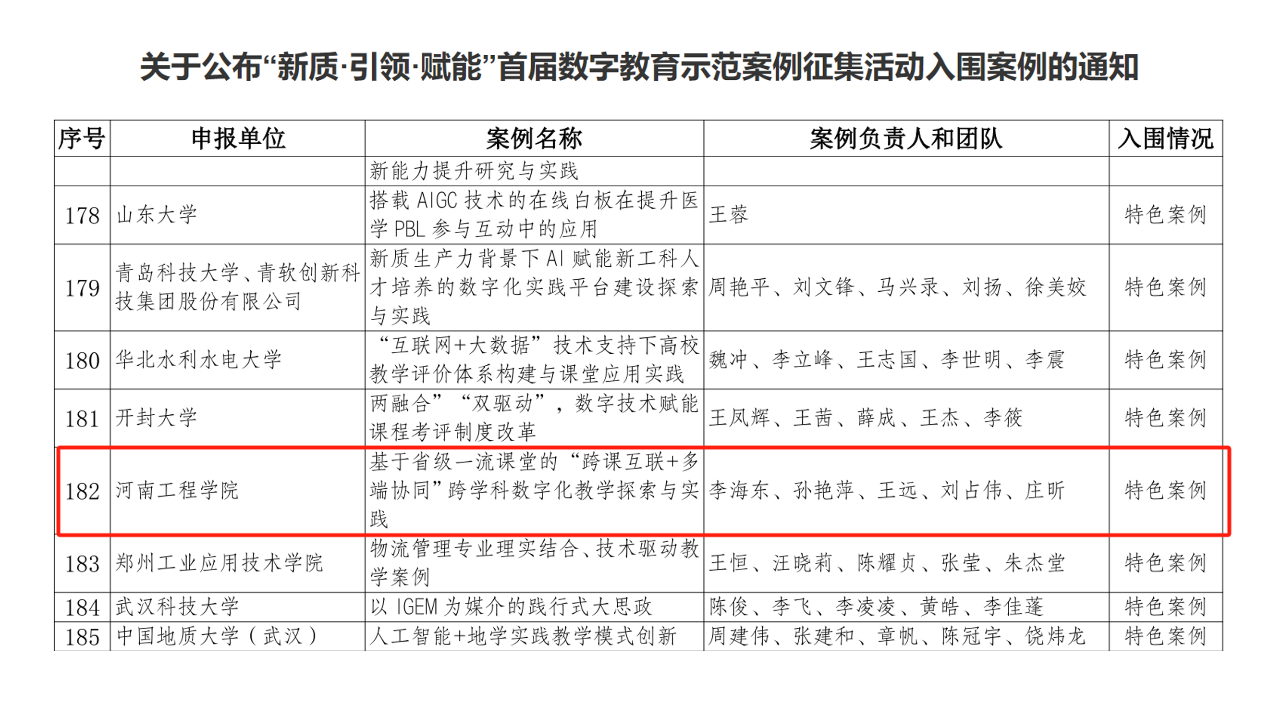 近日,中国教育技术协会印发《关于公布“新质·引领·赋能”首届数字教育示范案例征集活动入围案例的通知》,公布了首批标杆案例107个、优秀案例181个、特色案例311个。我校理学院李海东团队选送的《基于省级一流课程的“跨课互联+多端协同”跨学科数字化教学探索与实践》入选特色案例。