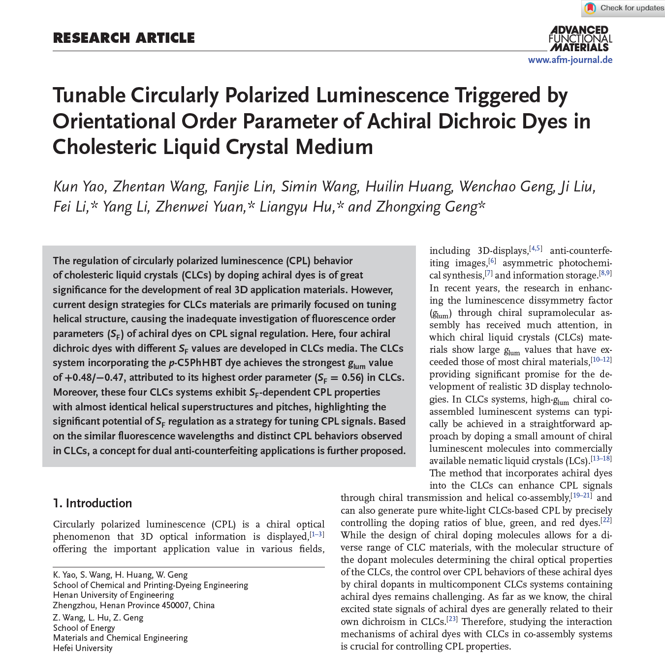 近日,化工与印染工程学院教师姚昆博士以第一完成人,在材料类卓越期刊《先进功能材料》(Advanced Functional Materials)上发表题目为“Tunable Circularly Polarized Luminescence Triggered by Orientational Order Parameter of Achiral Dichroic Dyes in Cholesteric Liquid Crystal Medium”的研究论文,我校为第一完成单位。