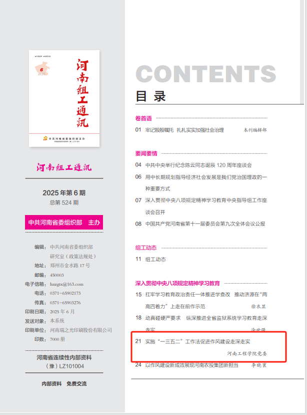 编者按:深入贯彻中央八项规定精神学习教育启动以来,学校党委高度重视,将学习教育作为党建工作的重要任务,认真贯彻落实中央、省委关于学习教育的部署要求,坚持学、查、改一体推进,探索出了以学习教育扎实成效为学校高质量发展提供坚强保障的经验做法,被《河南组工通讯》2025年第6期采用。现予以全文转载。