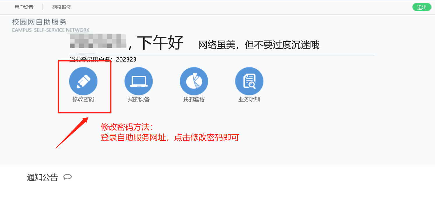 2.账号密码修改:在浏览器地址栏中输入校园网自助服务网址,进入后即可修改密码。特别提醒:为保障上网帐号安全,建议大家首次登录成功后,立即进行密码修改。