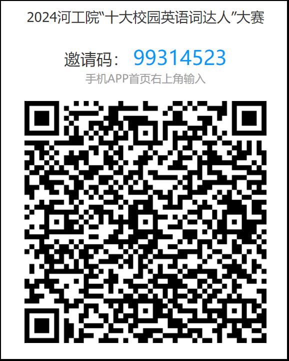 选手通过APP学习通扫描下方二维码进入202477779193永利官网“十大校园英语词达人”大赛,或输入邀请码99314523进入。赛事的相关通知将在此平台发布。