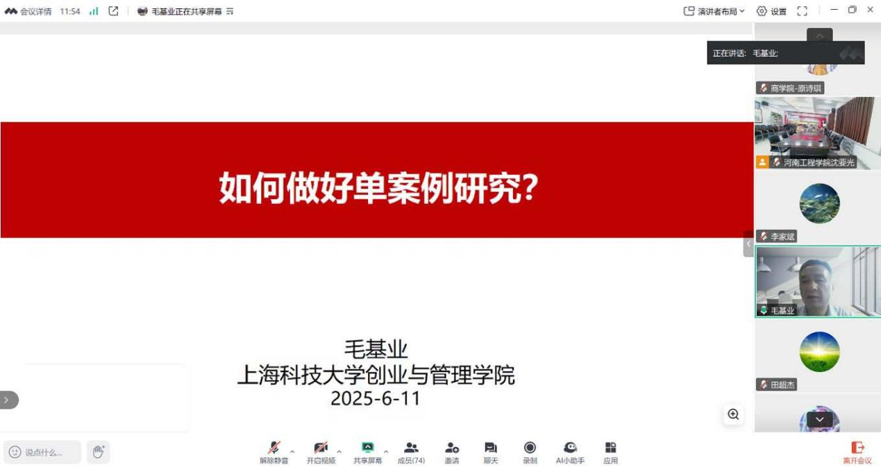 为进一步提升我校青年教师科研能力,促进学术交流与创新,6月11日,商学院特邀国内知名管理学者毛基业教授为我校教师及学生开展学术讲座。商学院、经贸学院、会计学院等学院的青年科研教师以及部分学生,共计70余人通过线上方式参与了本次讲座。讲座由商学院科研院长田超杰主持。
