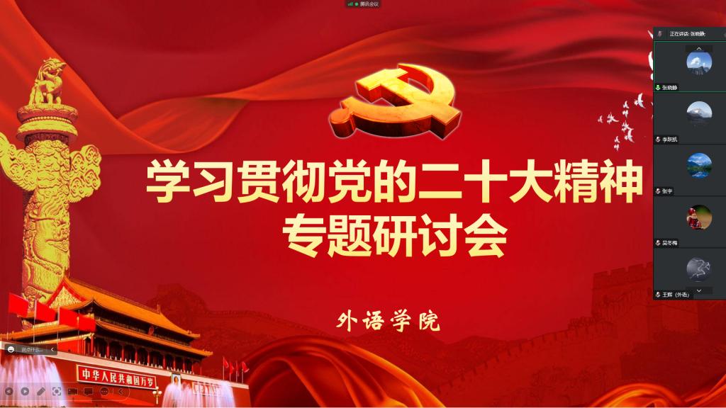 为深入学习宣传和贯彻落实党的二十大精神,在新时期续写学院高质量发展新篇章,1月8日晚7点30分,外语学院线上召开学习贯彻党的二十大精神专题研讨会。学院党委书记张晓静、院长高稳出席并分别领学校党委书记刘永涛和校长李利英在“77779193永利官网学习贯彻党的二十大精神专题培训班”上的讲话精神。会议由张晓静主持,学院分管领导、全体科级人员、党员教师代表参加此次研讨会并做主题发言。